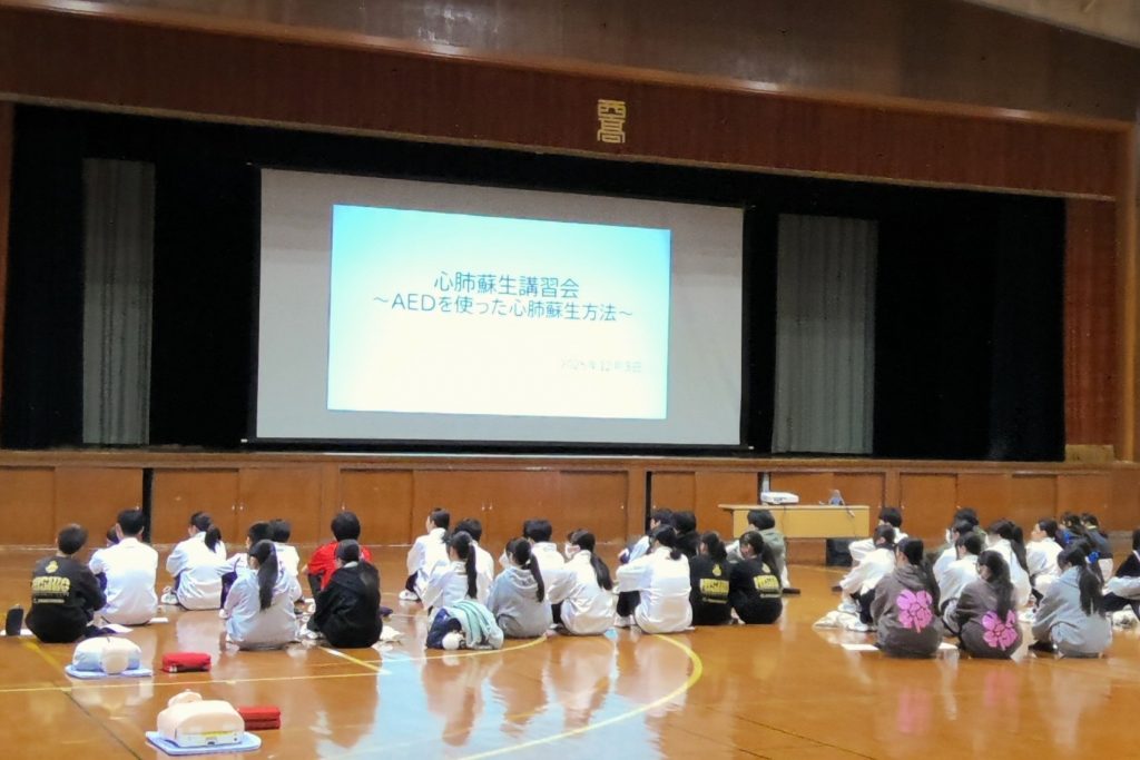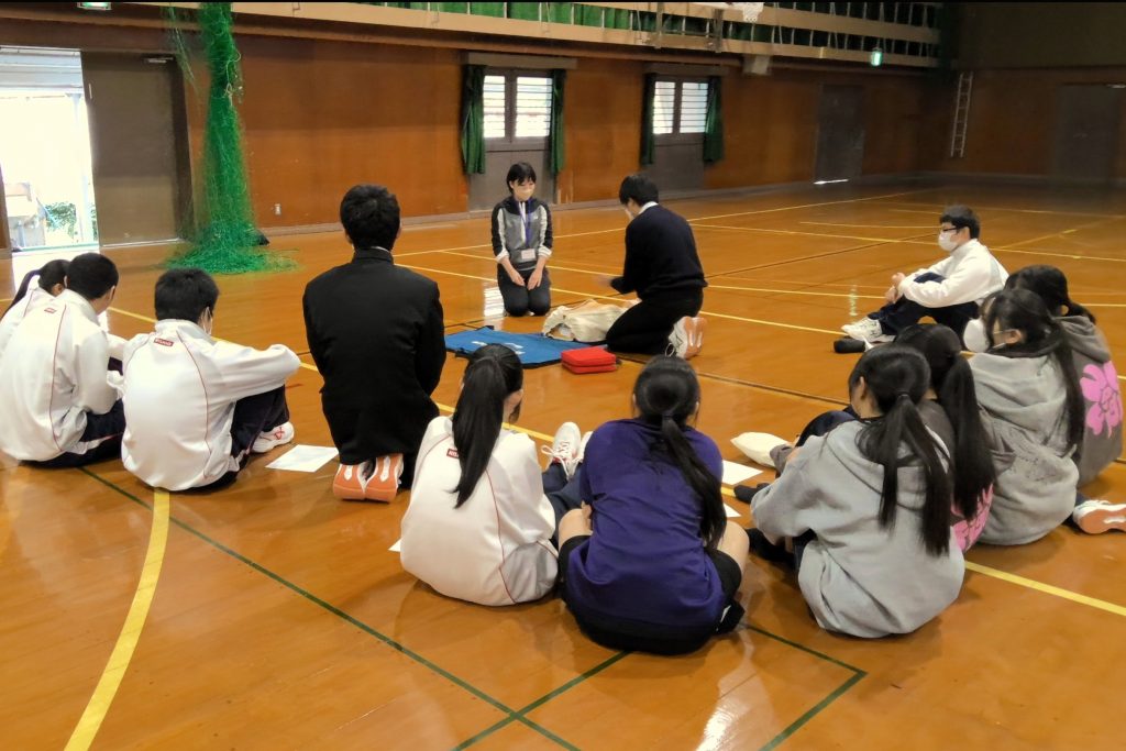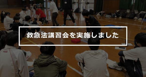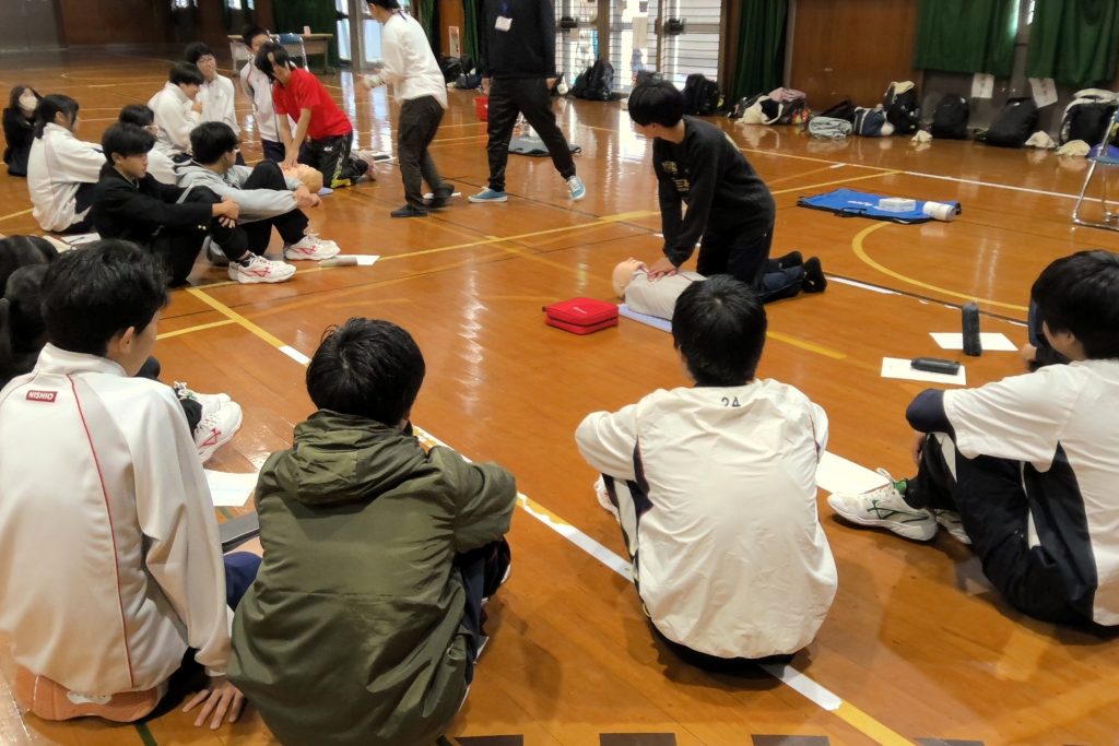 部活動代表・生徒会の生徒を中心に約80名の参加があり、全体での説明のあと小グループに分かれての実技講習を行いました。